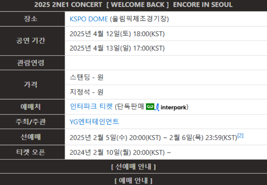 2NE1 2025 앵콜 콘서트 티켓 예매는 인터파크 티켓을 통해 진행됩니다. 팬이라면 선예매를 통해 보다 좋은 자리를 확보할 수 있는 기회가 있으니, 팬클럽에 가입해 두고 선예매 기간을 놓치지 않는 것이 중요합니다.